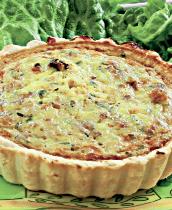 4. Se lasă să se răcească compoziţia la temperatura camerei şi, între timp, se întinde aluatul cu sucitorul, se împarte pentru 8 forme şi se aranjează prin presare. Se toarnă compoziţia de ciuperci şi se bagă în cuptorul cald.