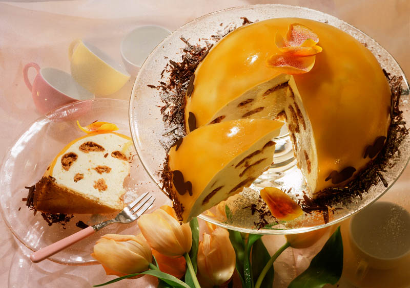 3. Se lasă două foi de gelatină la înmuiat în apă rece, apoi se amestecă la cald cu sucul de caise. Se toarnă într-un castron şi se roteşte până când acesta se acoperă uniform cu un strat de jeleu. Se pune castronul la frigider.