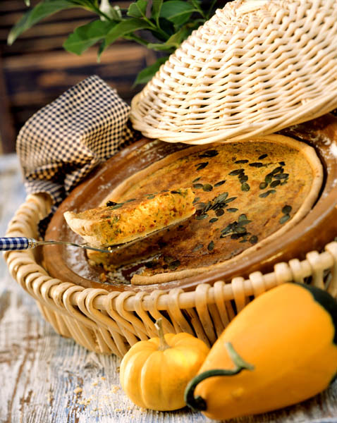 3. Se întinde aluatul într-o foaie subţire şi se pune în tava unsă cu unt şi tapetată cu făină. Se înţeapă cu furculiţa şi se coace în cuptorul bine încins, la foc iute, 10 minute. Se scoate din cuptor, se lasă puţin deoparte, apoi se toarnă umplutura de dovleac. Se presară seminţele de dovleac şi se mai coace aproximativ 45 de minute.