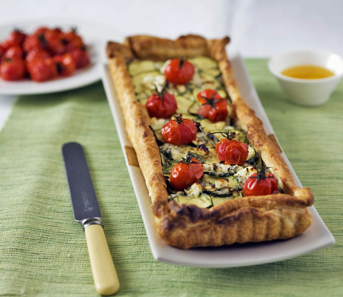 4. Ouăle se bat bine şi se amestecă cu brânza şi puţină sare şi piper, se toarnă peste legumele din tartă, se pun roşioarele şi se dă la cuptor pentru 40 de minute.