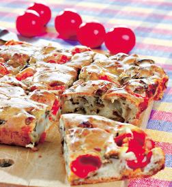4. Compoziţia se toarnă în tava tapetată cu hârtie pentru copt, se asezonează cu roşiile şi cu ciupercile călite, se presară cimbru şi busuioc şi se bagă în cuptor. După ce s-a copt, se scoate, se lasă să se răcească şi se serveşte cu suc de roşii sau iaurturi.