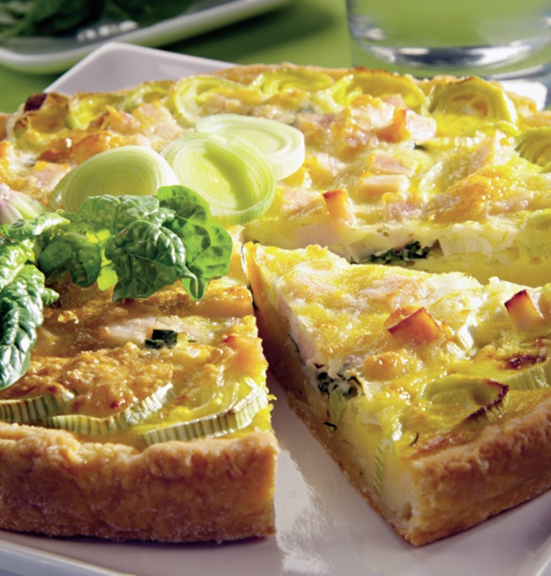 1. Aluatul se lasă la decongelat şi, între timp, prazul tăiat rondele se căleşte în unt.