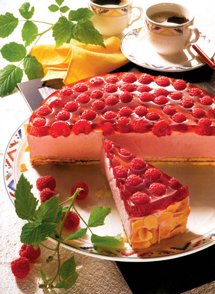 4. Pentru umplutură, jumătate din zmeură se mixează cu zahărul, zeama de lămâie şi iaurtul. Se înglobează mai întâi gelatina înmuiată, apoi şi frişca bătută. Se întinde crema pe cele două blaturi şi se ornează cu jeleul de zmeură, restul de fructe şi migdalele tocate mărunt. Se lasă la rece două ore.