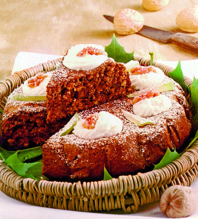 3. Compoziţia se toarnă într-o tavă cu diametrul de 24 cm, tapetată cu hârtie de copt. Se dă în cuptorul preîncălzit, la foc mediu. Se lasă la copt 40 de minute, apoi se scoate şi se lasă să se răcească. Se presară zahăr pudră deasupra şi se ornează cu frişcă şi miez de nucă.