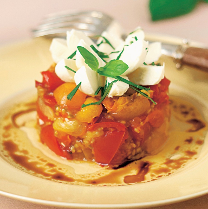 3. În farfuria de servit se asaza forma de metal, se umple cu rosioare, deasupra se taie câte 4 bile mici de mozzarella, se toarna marinata si se decoreaza cu frunze de busuioc. Se consuma imediat.