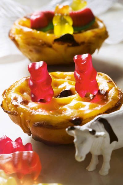 4. Se lasă să se răcească, apoi se adaugă vanilia, se toarnă în tartele coapte şi se gratinează în cuptorul încins, 10-12 minute. Când se răcesc se pudrează cu scorţişoară şi se ornează cu figurine din jeleu.