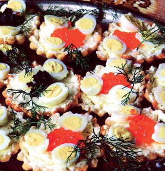5. Tartele se decorează cu jumătăţile de ou fierte, cu grămăjoare de icre şi cu puţin mărar.