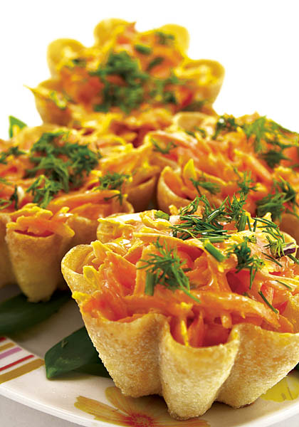 4. Separat, se întinde aluatul cu sucitorul, se taie bucăţi potrivite şi se aranjează în forme. Se bagă la cuptor şi se coc la foc potrivit. Se umplu cu compoziţia de legume şi se servesc ornate cu pătrunjel.
