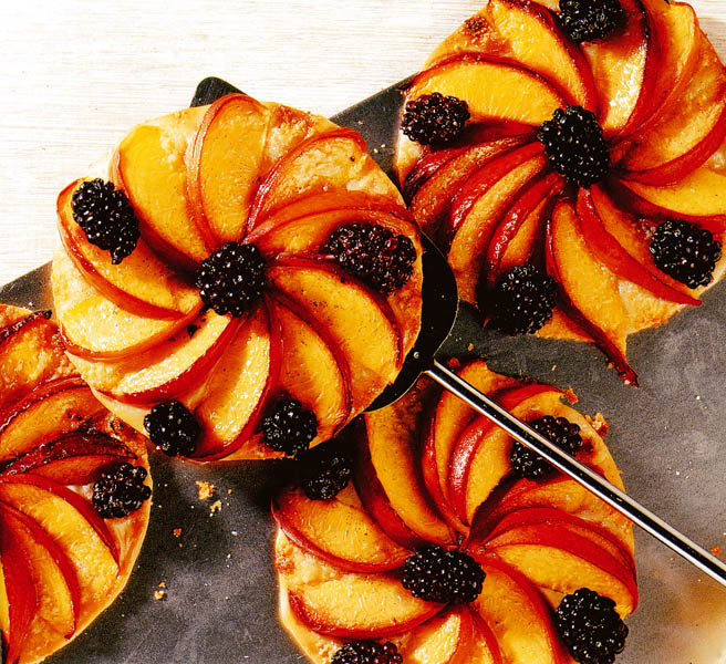 4. Se împarte compoziţia de nuci pe fiecare tartă, apoi se acoperă cu felii de piersici şi mure. Se coc în cuptorul încins, la foc potrivit, 25-30 minute. După primul sfert de oră se reduce focul.