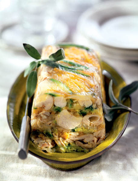4. Se taie şi pieptul de pui cubuleţe şi se amestecă cu legumele, se condimentează cu sare şi piper şi se amestecă cu gelatina. Compoziţia obţinută se aşază într-o tavă de cozonac tapetată cu folie de plastic. Se bagă la rece pentru aproximativ 2-3 ore şi se serveşte ca aperitiv.