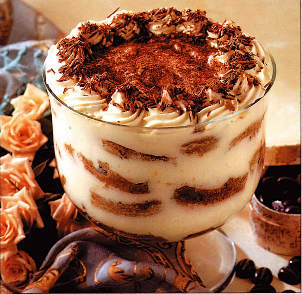 3. Într-un castron se pun cafeaua strecurată şi coniacul. Pişcoturile se înmoaie, 1 – 2 secunde, în cafea şi se pun în straturi succesive cu crema, în cupe transparente. Se ornează cu ciocolată rasă şi cacao. Se lasă la rece 3 ore.