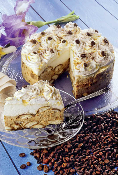 5. Se înmoaie pişcoturile în siropul strecurat şi se aşază în tavă într-un strat, se toarnă crema, şi tot aşa, iar tortul se îmbracă cu un strat de frişcă, se ornează cu boabe de cafea şi se presară cafea solubilă din loc în loc. Se lasă la rece câteva ore, apoi se serveşte.
