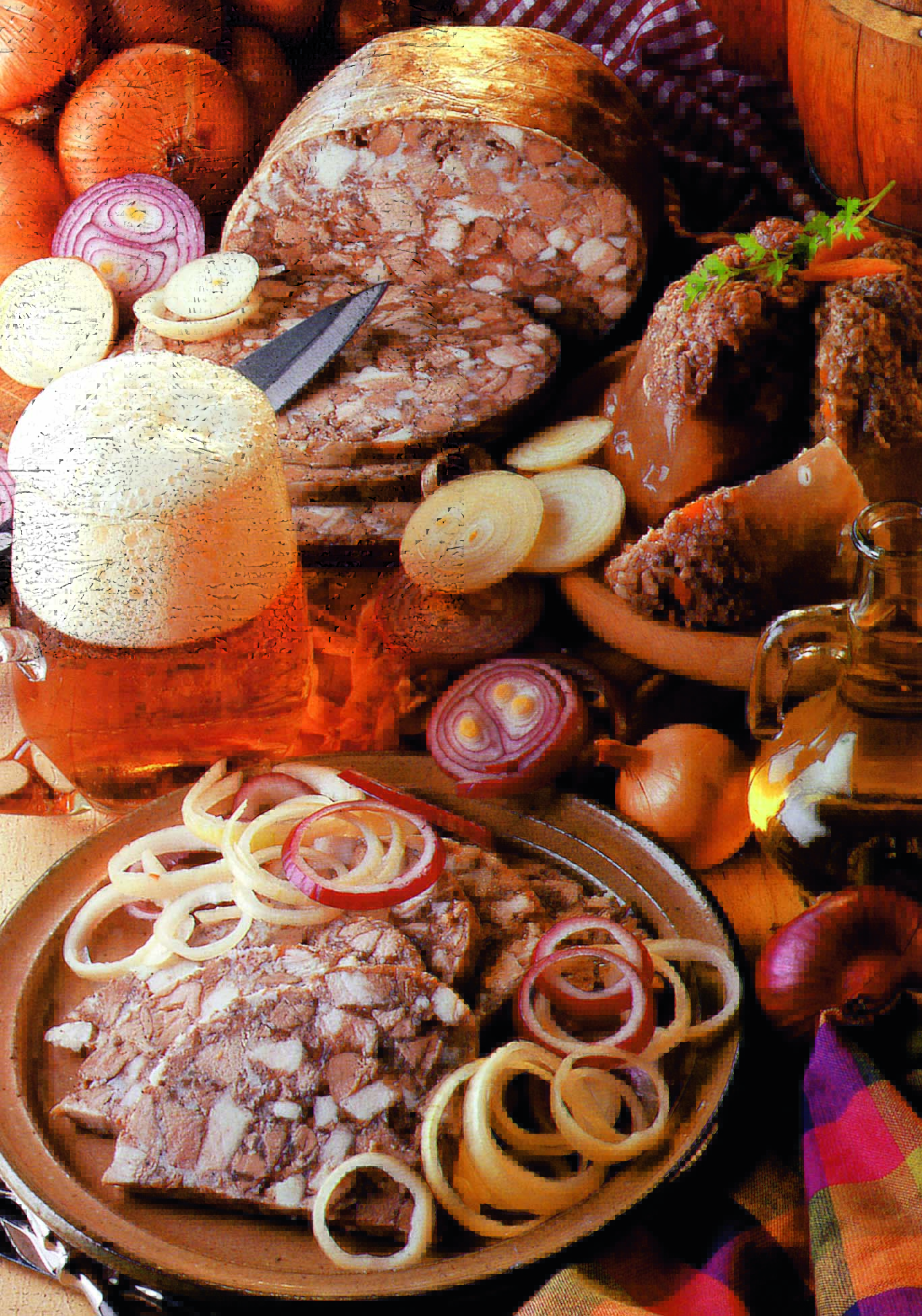 1. Bucăţile de carne cu şorici se pârlesc şi se curăţă bine. Se spală apoi toată carnea şi se pune la foc într-o oală cu apă rece, un praf de sare, ceapa, usturoiul şi morcovii. Limba se pune fiartă separat, curăţată de pieliţe. Se spumează şi se adaugă mirodeniile. Se fierbe acoperit, până se desprinde carnea de pe os. Se scoate carnea şi se lasă să se răcească, iar supa se păstrează.
