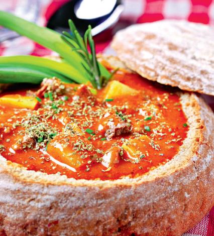 - Se mai lasă să clocotească câteva minute şi se bagă în cuptor. În acest timp, se taie pâinea, se scoate miezul şi, când tocana este gata, se serveşte fierbinte în crustă şi se ornează cu cimbru, rozmarin şi mărar proaspăt.