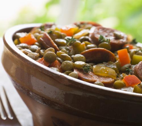 2. Între timp se încălzeşte ulei de măsline într-o cratiţă, se adaugă ceapa şi usturoiul tocate mărunt. Se adaugă fasolea, lintea, bulgurul, foile de dafin şi se amestecă bine. Se adaugă apă îndeajuns pentru a fierbe fasolea şi lintea, dar nu ca la o supă. Se fierbe 35 de minute. Se adaugă dovleceii spălaţi şi tăiaţi în felii groase de 2-3 cm. Se mai fierb 5-10 minute sau până ce legumele sunt moi.