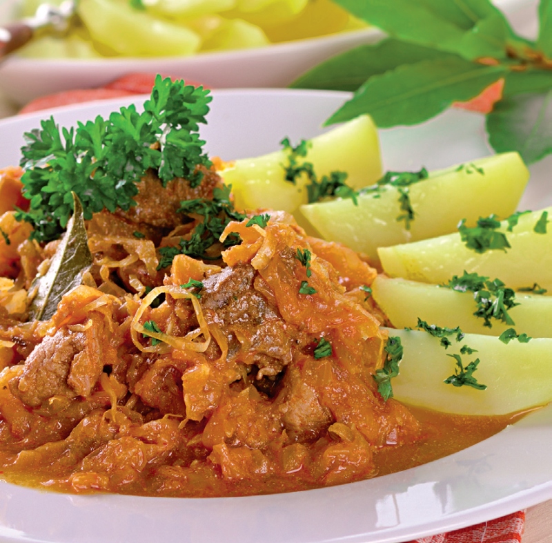 3. Într-o tigaie cu fund dublu se încinge uleiul şi se căleşte carnea doar cât să-şi schimbe culoarea pe toate părţile. Apoi se scoate şi, în acelaşi ulei, se pun ceapa şi morcovii. Se lasă la călit până ce legumele devin translucide, se adaugă şi carnea şi se toarnă vinul. Se lasă pe foc să se evapore vinul şi apoi se adaugă apă cât să acopere ingredientele. Se adaugă foaia de dafin, sare şi piper, se acoperă şi se lasă la fiert la foc mic.