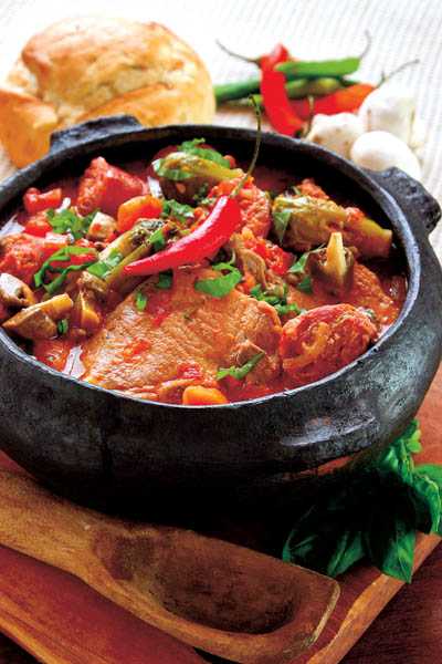 3. Cartofii, morcovii şi ardeii se curăţă, se spală, se taie cubuleţe şi se adaugă în cratiţă. Se lasă să fiarbă iar, spre final, se pune pulpa de roşii, usturoiul pisat, se condimenteazăcusare, boiadulce şi iute, piper şi chili şi se bagă în cuptorul încins în prealabil.