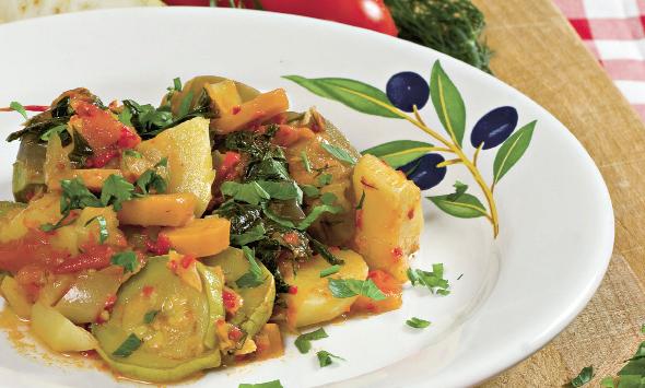 3. Vinetele, roşiile şi dovleceii se taie în rondele mari şi se adaugă împreună cu zeama lor, în ceaun. Se sărează şi se condimentează, apoi se adaugă şi verdeaţa tocată mărunt. Se pune capacul şi se lasă la foc mic pe aragaz, sau se bagă la cuptor, la maximum 150˚C, timp în care nu se amestecă.