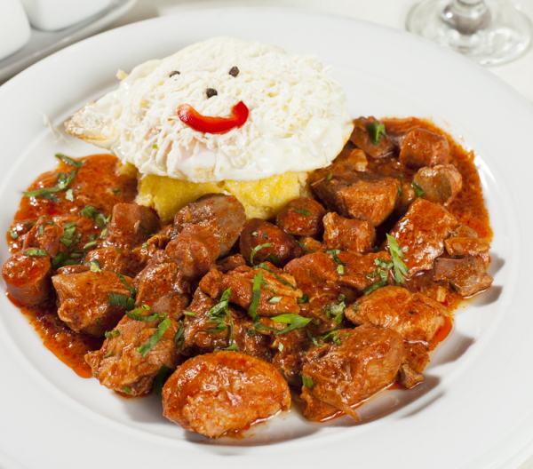 4. Tochitura se serveşte alături de un “cocoloş” de mămăligă, peste care se pune un ou ochi mai zemos şi se rade brânză sau caşcaval.