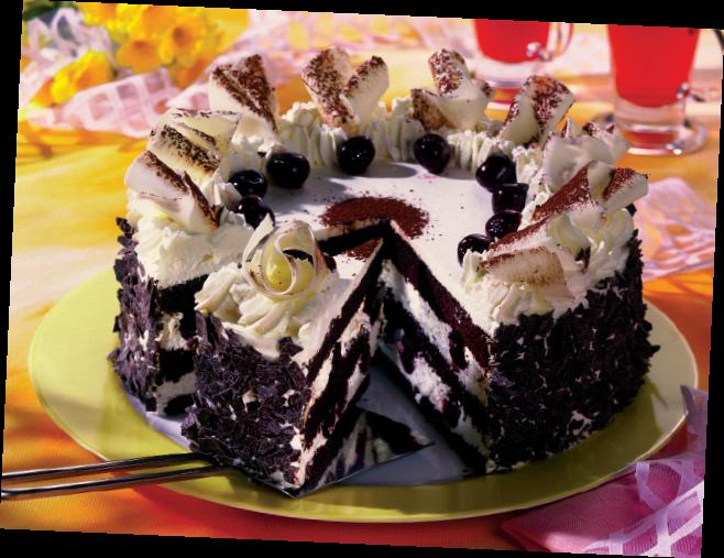 4. Se taie blatul în trei foi, se stropeşte cu siropul de afine, se pune frişca iar fructele se presară din loc în loc. Se ornează pe deasupra cu frişca rămasă, cu fulgi de ciocolată pe margine şi ornamente de ciocolată şi vişine.