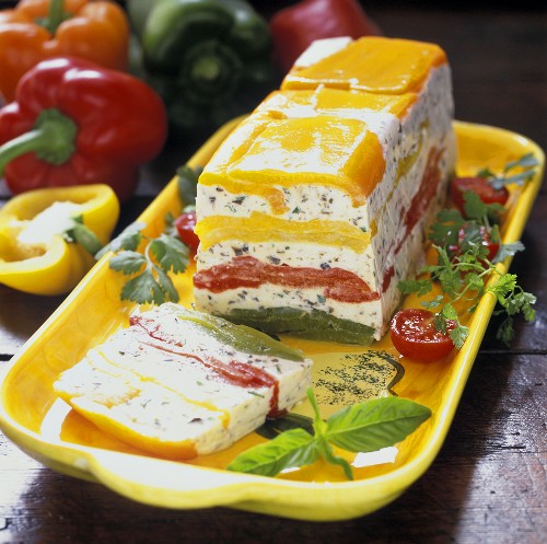 2. Crema de brânză se pregăteşte în felul următor. Pentru început se înmoaie gelatina în apă călduţă, dar puţină. Gelatina înmuiată se amestecă cu smântâna şi cu frişca şi se dau la rece. Brânza de capră se zdrobeşte cu mixerul până se face spumă, iar la sfârşit se pune mărarul tăiat mărunt. După ce s-au răcit ambele creme se amestecă până se omogenizează. Această cremă, deosebit de fină se mai lasă la rece puţin, iar între timp pe un platou se pune un rând de ardei, ce culoare doriţi, apoi un strat de cremă de brânză, un alt rând de ardei şi tot aşa, până se formează un tort dreptunghiular.