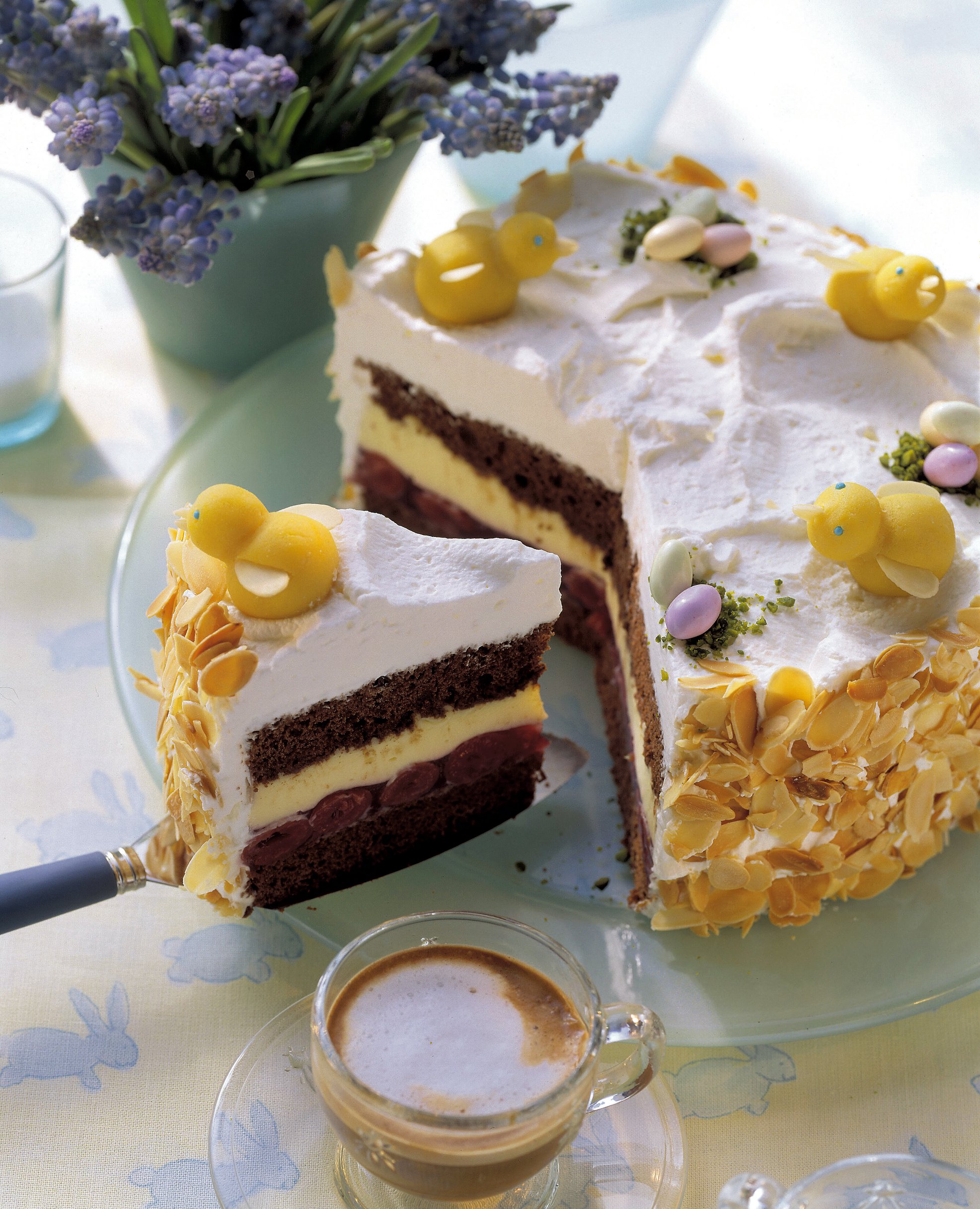 4. Se toarnă crema pe stratul de vişine, apoi se acoperă cu celălalt blat şi se însiropează uşor. Se îmbracă tortul cu frişca bătută cu zahărul vanilat şi întăritorul de frişcă, apoi se ornează cu migdale, fistic şi figurine.