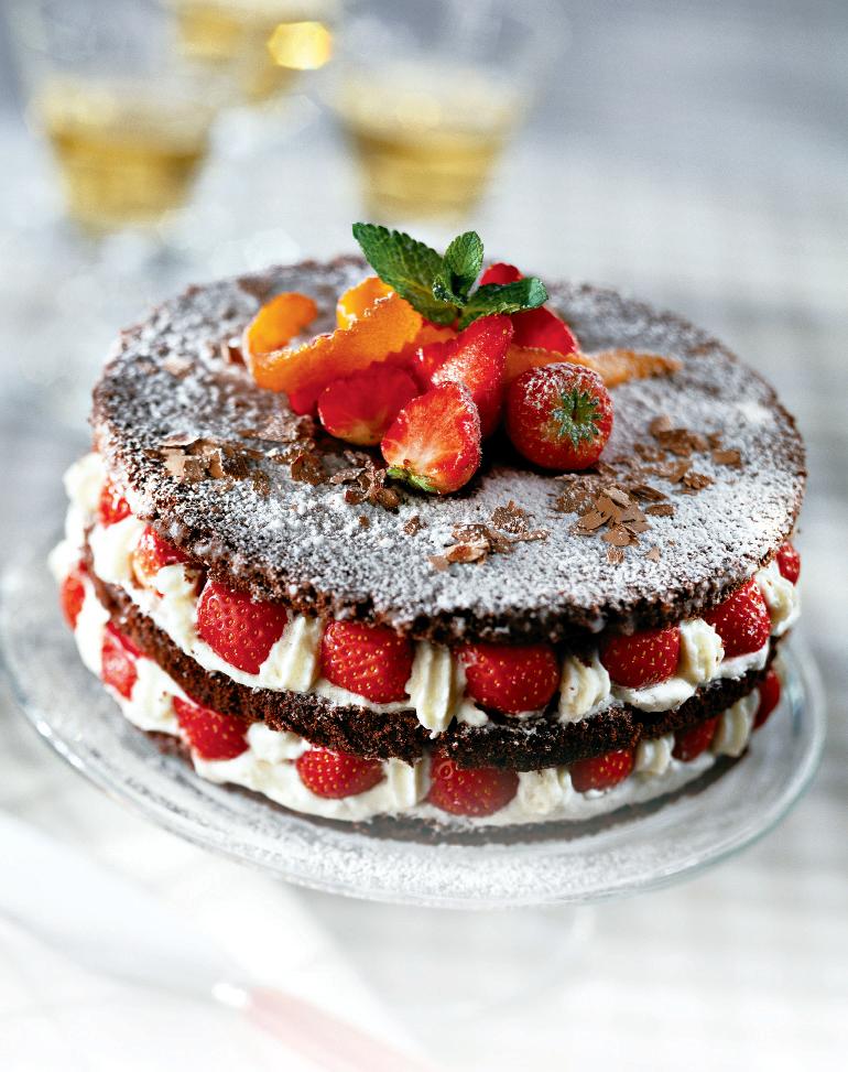 4. După ce s-a copt blatul, se scoate din cuptor, se răceşte şi se taie în trei foi. Peste prima foaie se pune un strat de cremă, căpşuni, apoi a doua foaie, cremă, căpşuni şi ultima foaie. Tortul se ornează cu căpşuni proaspete, coajă de portocală, fulgi de ciocolată şi frunze de mentă.