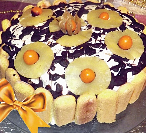 5. Se scoate blatul de tort din formă, se scoate hârtia de copt, se așază la loc blatul, se adaugă crema deasupra și se dă la frigider pentru minimum trei ore. După expirarea timpului și dacă este perfect stratul de cremă, se poate trece la decorarea acestuia, după cum urmează: se rup pișcoturile în două și se vor trece prin șampanie, punându-le pe partea laterală a tortului. După ce s-a terminat această operațiune, se pune ciocolata la topit la bain-marie, iar după aceea se va lăsa la răcit.