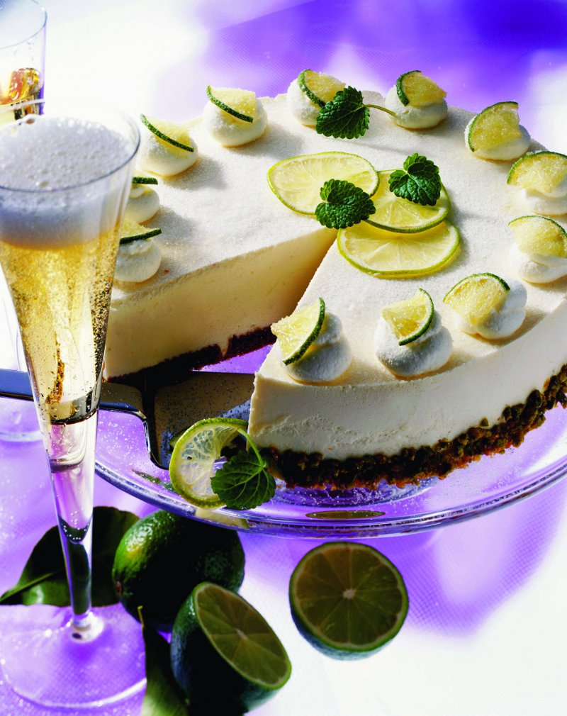 4. Când crema s-a întărit, se îndepărtează partea detaşabilă de la forma de pe tort şi se ornează cu fistic caramelizat, frişcă, zahăr şi lămâie.