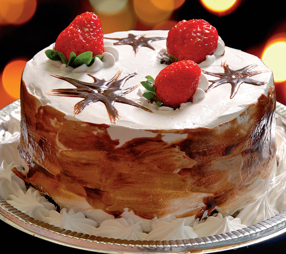 4.    Se taie blatul, se umple cu crema si apoi se acopera cu frisca batuta rece. Pentru glazura de ciocolata, se topesc ciocolata si untul si dupa aceea se adauga frisca. Cu aceasta se decoreaza tortul, dupa imaginaţie. Se da la rece pentru 12 ore.