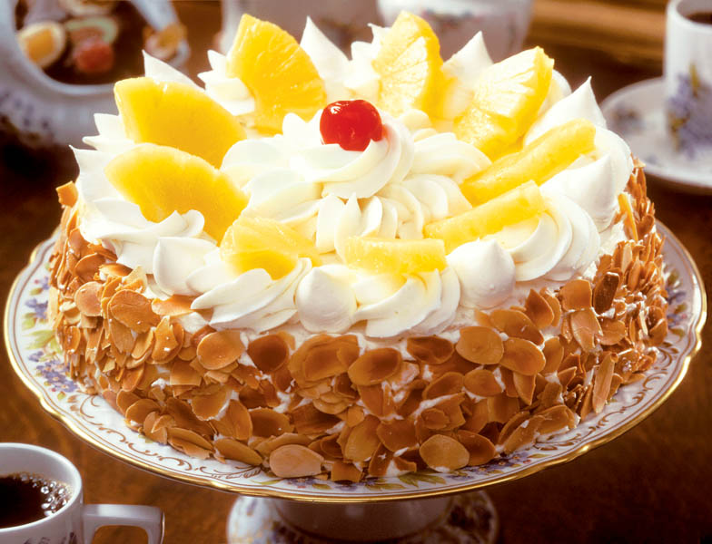3. Se taie blatul transversal în două foi, care se însiropează cu siropul din compot şi se umplu cu crema de brânză. Se păstrează 1/3 din frişcă pentru ornat, iar cu restul se îmbracă tortul. Se ornează apoi cu migdale, frişcă, ananas şi cireaşa confiată. Se lasă 2 ore la rece şi după aceea se poate servi.