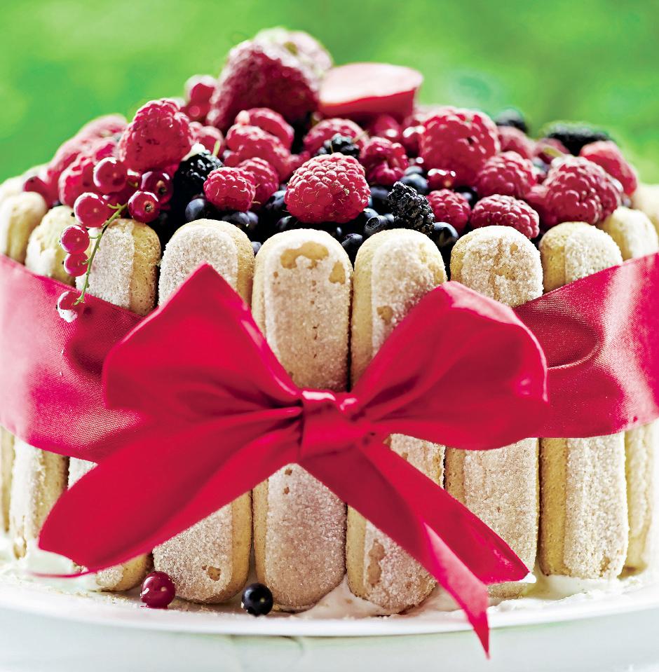 4. Se lasă la rece aproximativ 2 ore, astfel încât să se înmoaie pişcoturile. Se scoate din formă şi se ornează cu fructe şi cu frunzuliţe de mentă. Se poate decora cu o fundă festivă roşie.