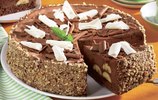 5. Într-un bol mai mic, se pune cacaua şi se amestecă cu coniacul şi puţină cremă. Se omogenizează şi apoi se toarnă în restul de cremă, care se amestecă cu frişca şi se lasă 2-3 minute la rece. Se scoate blatul din tavă, se aranjează pe un platou, şi se pun banane pe toată suprafaţa. Se toarnă crema, se întinde şi se balotează cu nucă măcinată. Se ornează cu ciocolată şi se lasă la rece.
