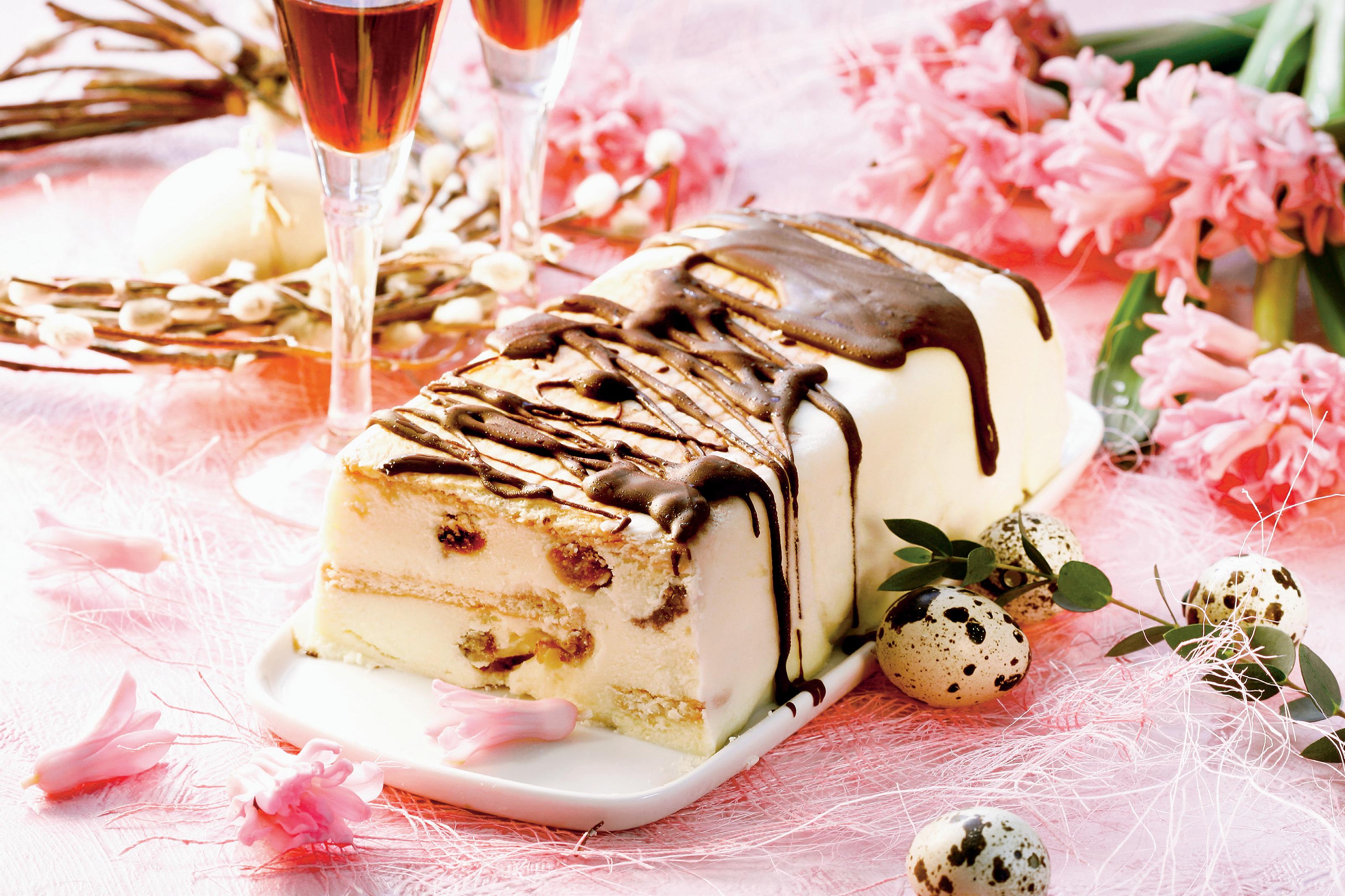 3. Pentru îngheţată, se bat gălbenuşurile cu zahărul tos pe baie de abur, apoi se ia de pe foc şi se amestecă până se răcesc. După aceea se adaugă smântâna amestecată cu zahărul pudră, lichiorul de cafea, frişca bătută, fructele confiate. Se lasă la congelator o oră, apoi se montează tortul.