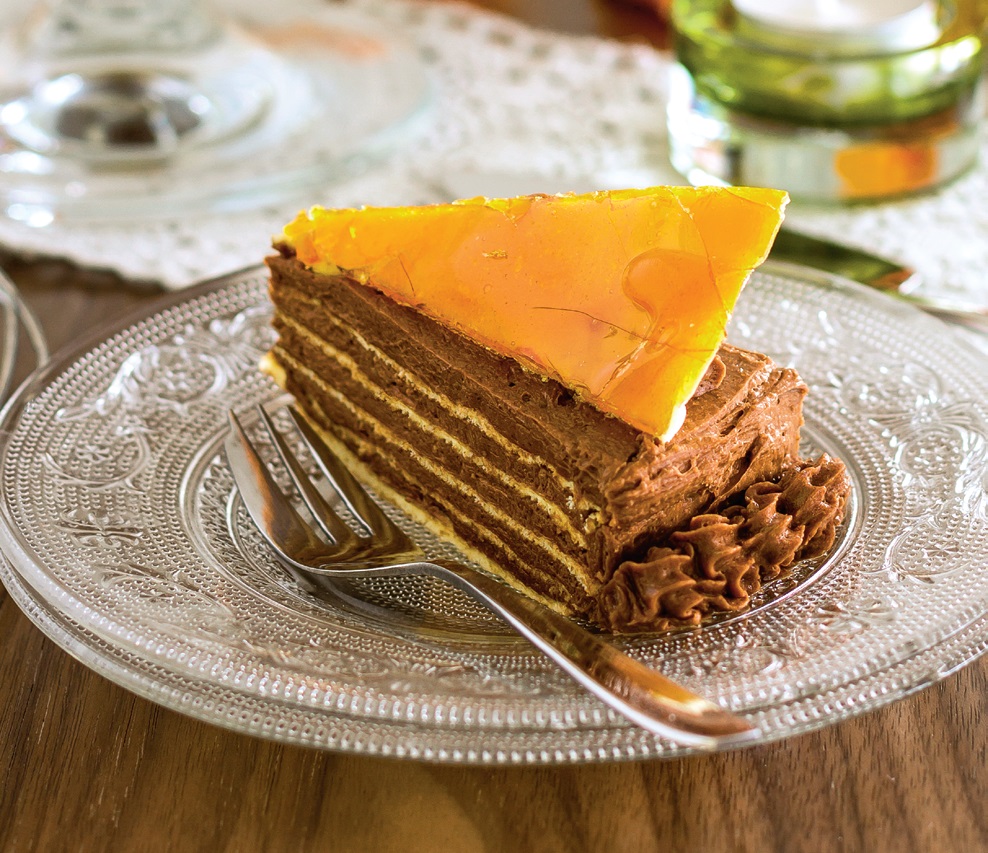 3. Se aşază straturi de foi şi cremă iar cu restul cremei se înveleşte tortul. Pentru glazură, se caramelizează zahărul şi se adaugă untul. Se toarnă amestecul pe o suprafaţă lucioasă şi se lasă să se întărească. Apoi se taie în 16 raze de cerc care se aşază pe tort.