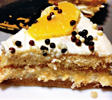 4.   Peste blatul de biscuiţi se întinde jumă­tate din crema de mascarpone cu frişcă, apoi se pune blatul de pişcoturi şi cealaltă jumătate din cantitatea de cremă. Tortul se ornează cu felii de portocală şi biluţe de ciocolată şi se lasă cel puţin 3 ore la frigider.