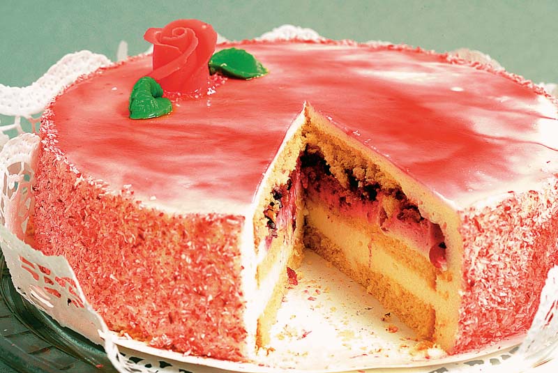 4. Blatul se taie în trei, se umple şi se ornează cu crema de iaurt şi dulceaţă. Se decorează cu sirop din dulceaţă şi nucă de cocos.