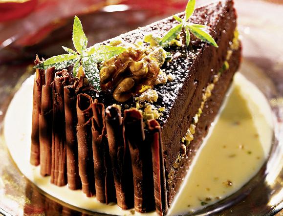 9. Se însiropează blatul cu apă şi zahăr, după care se pune compoziţia de nuci şi stafide şi, la sfârşit, mousse-ul de ciocolată.
