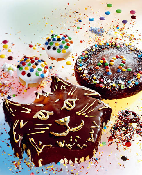 3. Prăjitura coaptă se lasă câteva minute în formă, apoi se scoate şi se lasă să se răcească. Se taie după conturul unui şablon făcut din hârtie, în forma unei pisici şi se aşază pe un platou. Se acoperă cu glazură de ciocolată şi se ornează cu ciocolată albă.