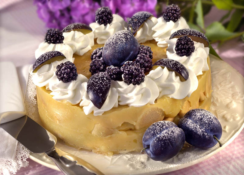 4. Se bate frişca şi se acoperă tortul cu crema rămasă şi apoi cu frişcă. Se ornează cu prune şi cu mure. Se serveşte după ce se bagă la rece o oră.