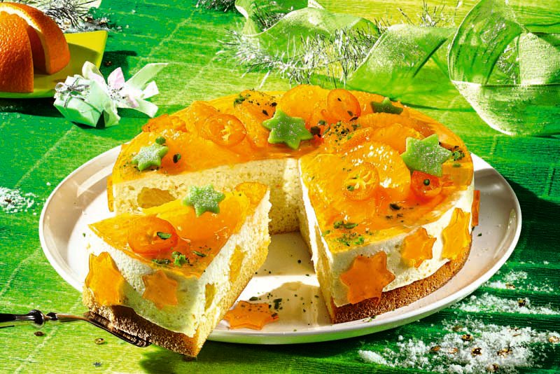 3. Compoziţia se pune la baie de aburi şi se amestecă continuu până se leagă, apoi se adaugă fructele şi coaja de portocală şi se lasă la rece. Se pune blatul într-o formă cu pereţii detaşabili, se însiropează, se toarnă crema, glazura de jeleu, se acoperă cu o folie cât stă la rece şi apoi se ornează cu steluţe din kiwi, portocală şi praf de fistic.