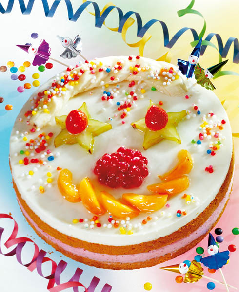 4. După ce s-a copt blatul, se taie în două, se umple cu cremă şi se ornează feţişoara de clown. Se bagă la rece 2-3 ore şi apoi se serveşte sărbătoriţilor.