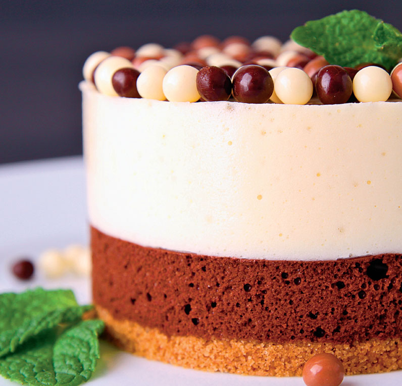 3. Pentru stratul de jos se mărunţesc biscuiţii şi se amestecă bine cu untul moale. Se răsfiră cu degetele şi apoi, în cercuri de metal aşezate pe farfurii sau o tavă, se clădeşte primul strat. Se decupează din blatul copt al doilea strat şi se pune în cercul de metal peste biscuiţi şi apoi se pune spuma de ciocolată albă.