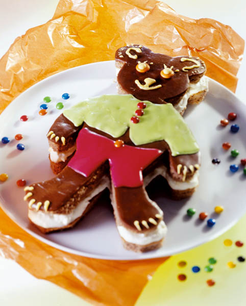 4. Blatul copt şi răcit se decupează cu un şablon. Se taie apoi pe orizontală în două foi, care se umplu cu cremă. Se ornează cu glazură de ciocolată şi bomboane.