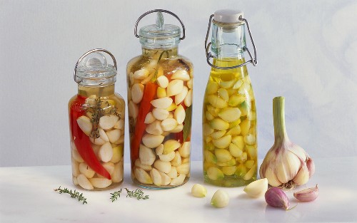 2. Se pregătesc 3 sticle sau borcane. Se pune usturoiul, în părţi egale, în fiecare şi câte 3 ardei iuţi în două dintre ele.