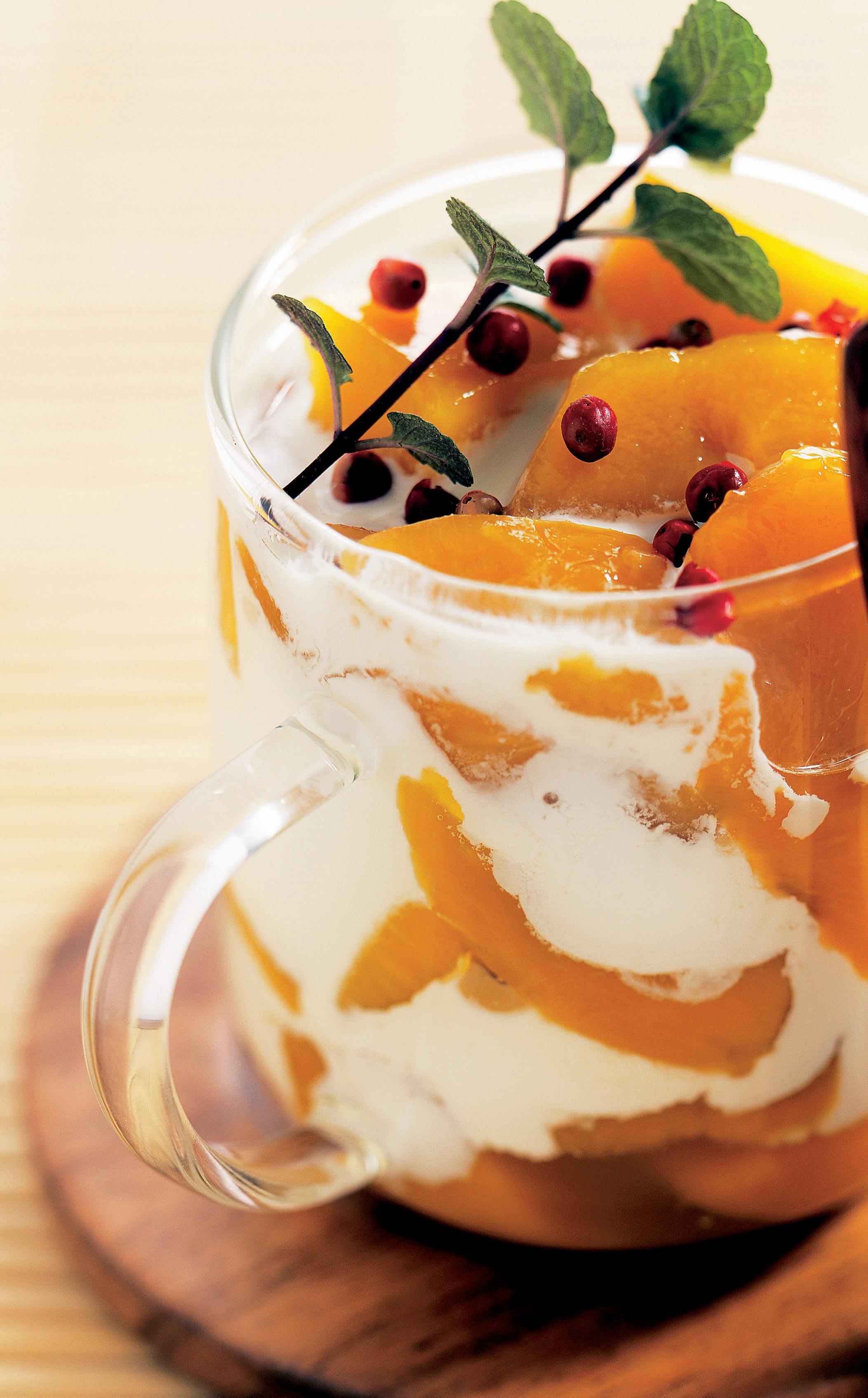4. Se pregătesc patru cupe pen­tru salată, care se umplu apoi cu fructele din bol. Se lasă la rece timp de 15 minute.