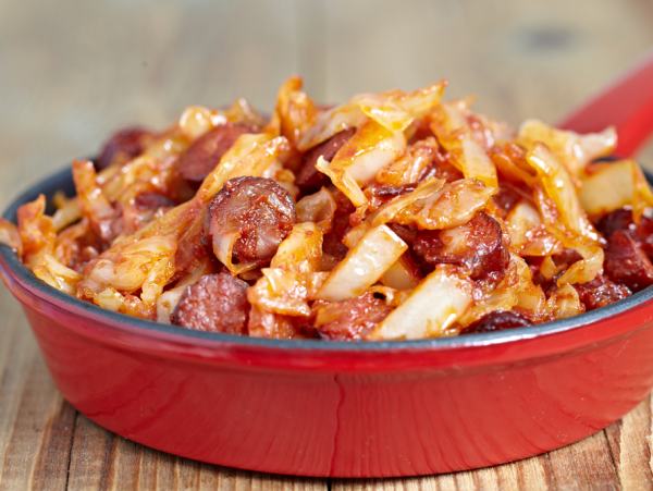 ► Se crestează cârnaţii şi se taie bucăţi mai mici, după care se pun peste varză. Se mai fierbe 15 minute. Se condimentează cu sare, piper şi zahăr, după gust. Se poate servi cu garnitură de cartofi copţi.