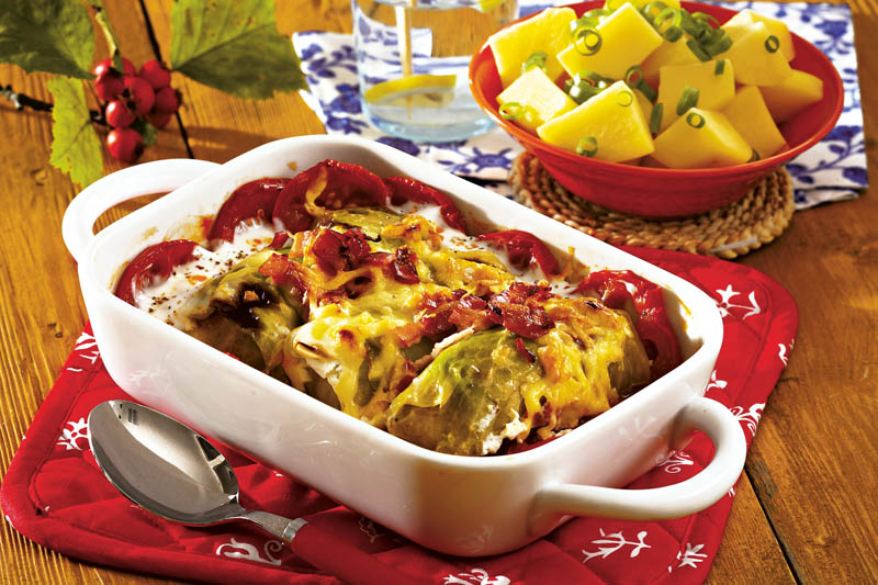 4. Spre sfârşit, se adaugă sosul de roşii şi piperul măcinat se bagă la cuptor până scade. Varza călită se scoate din cuptor,