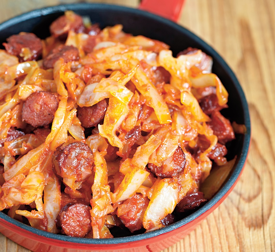 O mâncare de varză clasică după o reţetă foarte simplă: varză cu cârnaţi.