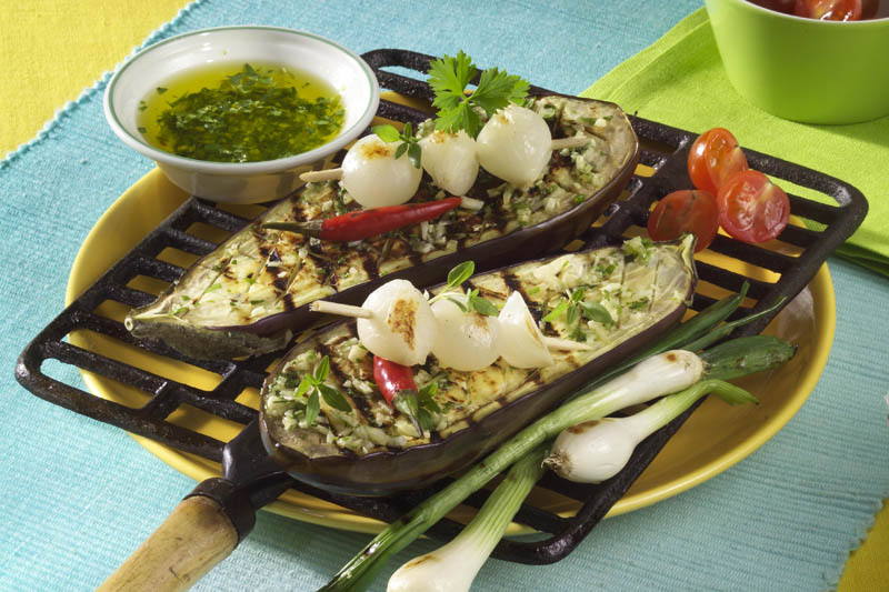 5. Ardeiul se coace şi el pe grătar, se curăţă şi se serveşte împreună cu celelalte legume coapte. Vinetele în saramură sunt foarte gustoase dacă sunt combinate cu frigărui de pui. Se servesc calde ornate cu mult pătrunjel verde şi usturoi tocat.